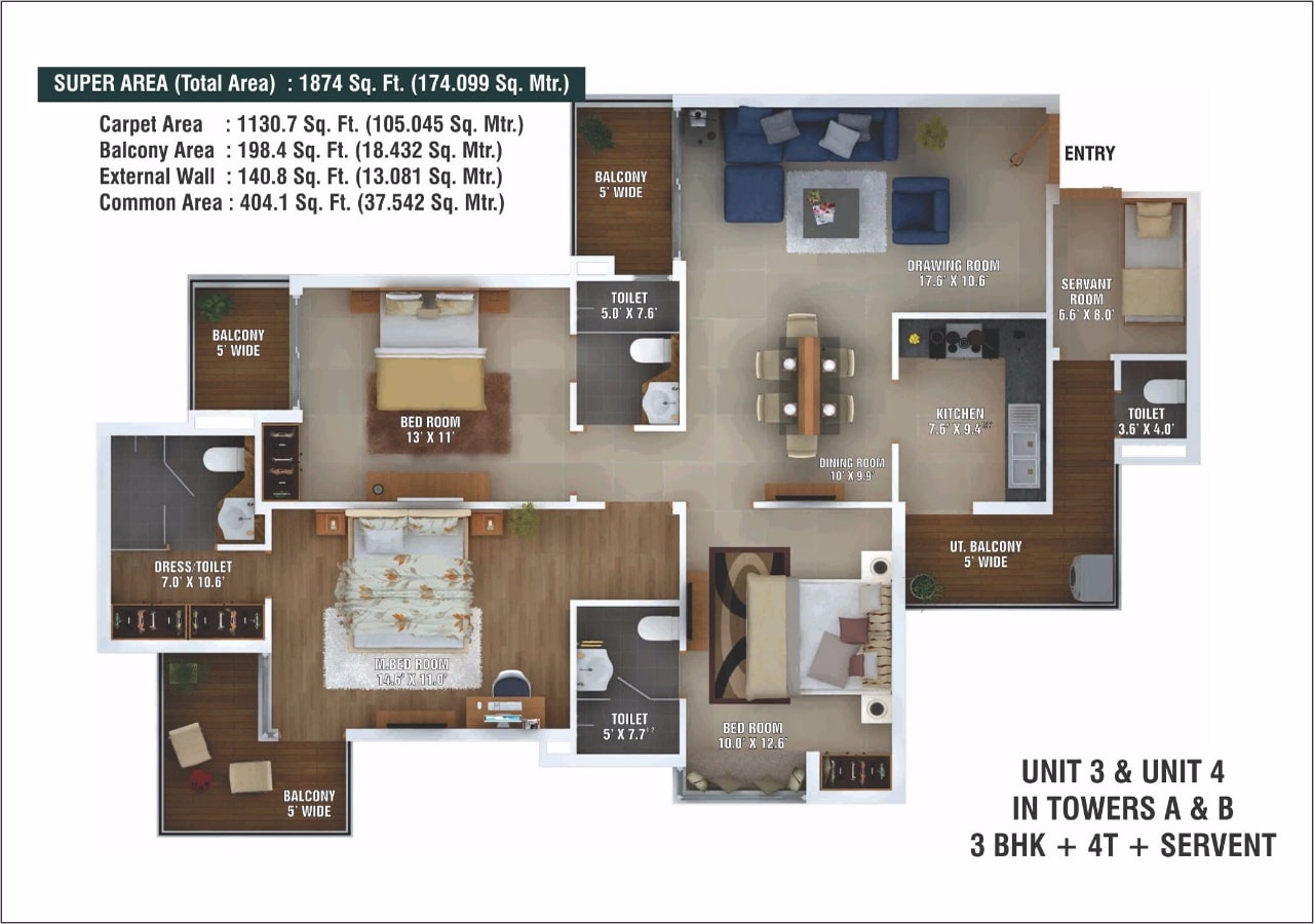 | 3 BHK + SERVANT | 1874 SQ.FT. |